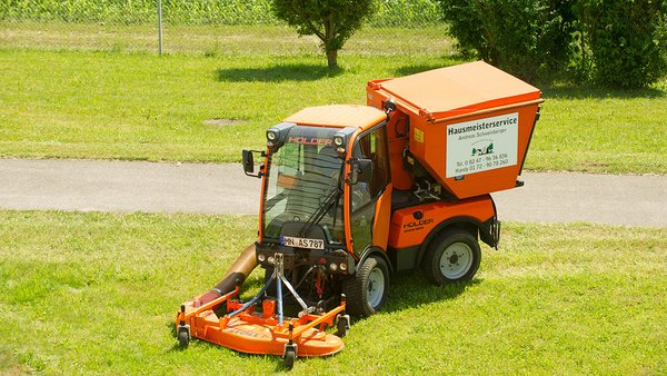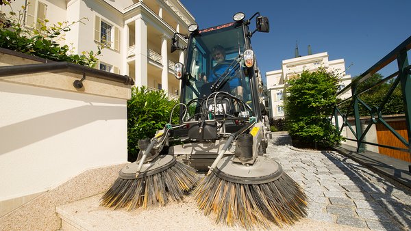 In den wärmeren Monaten werden die beiden C 250-Fahrzeuge vorrangig zum Rasenmähen und dem gleichzeitigen Rasenaufkehren eingesetzt. Eine Stoll-Absaugeinrichtung sorgt für ein effizientes und dabei die Grasnarbe schonendes Arbeiten. Beim Kehren, Reinigen und der Laub-Absaugung kommt dagegen mehr die kleinere X 30-Maschine zum Einsatz. „Gerade für unsere Wohnanlagen ist das ein Top-Gerät“, so Schweinberger. Die Maschine kehre und sauge äußerst sauber und könne dabei sogar Wasser ablassen, sodass die Staubentwicklung sehr gering sei. „Das ist schon ein kleiner Erfolg, das Kehren und Reinigen jetzt auch maschinell zu betreiben. Früher haben wir das mit der Hand gemacht bzw. mit so einem Sauger oder einem Besen. Wir betreuen ja auch Sparkassen und etliche Geschäftshäuser, und da macht es schon einen sehr guten Eindruck, wenn man mit so einer Maschine kommt.“